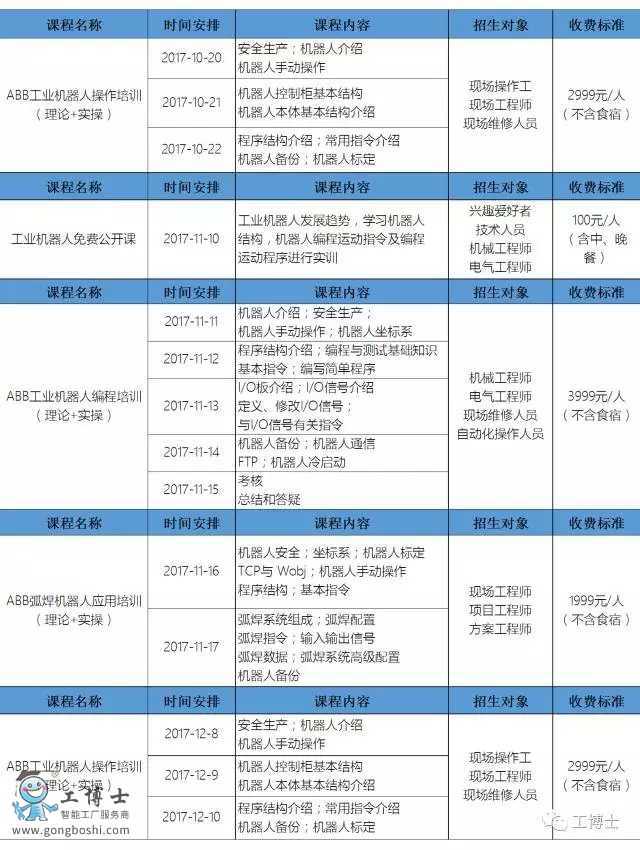 從金秋九月開始,我們將在每月開設(shè)一天的機(jī)器人免費(fèi)公開課,屆時(shí)歡迎大家的參加,讓我們近距離的了解工業(yè)機(jī)器人,為未來開啟一扇窗戶。 2017年ABB下季度課程時(shí)間安排 ![]() ![]() ![]() ![]() ![]()